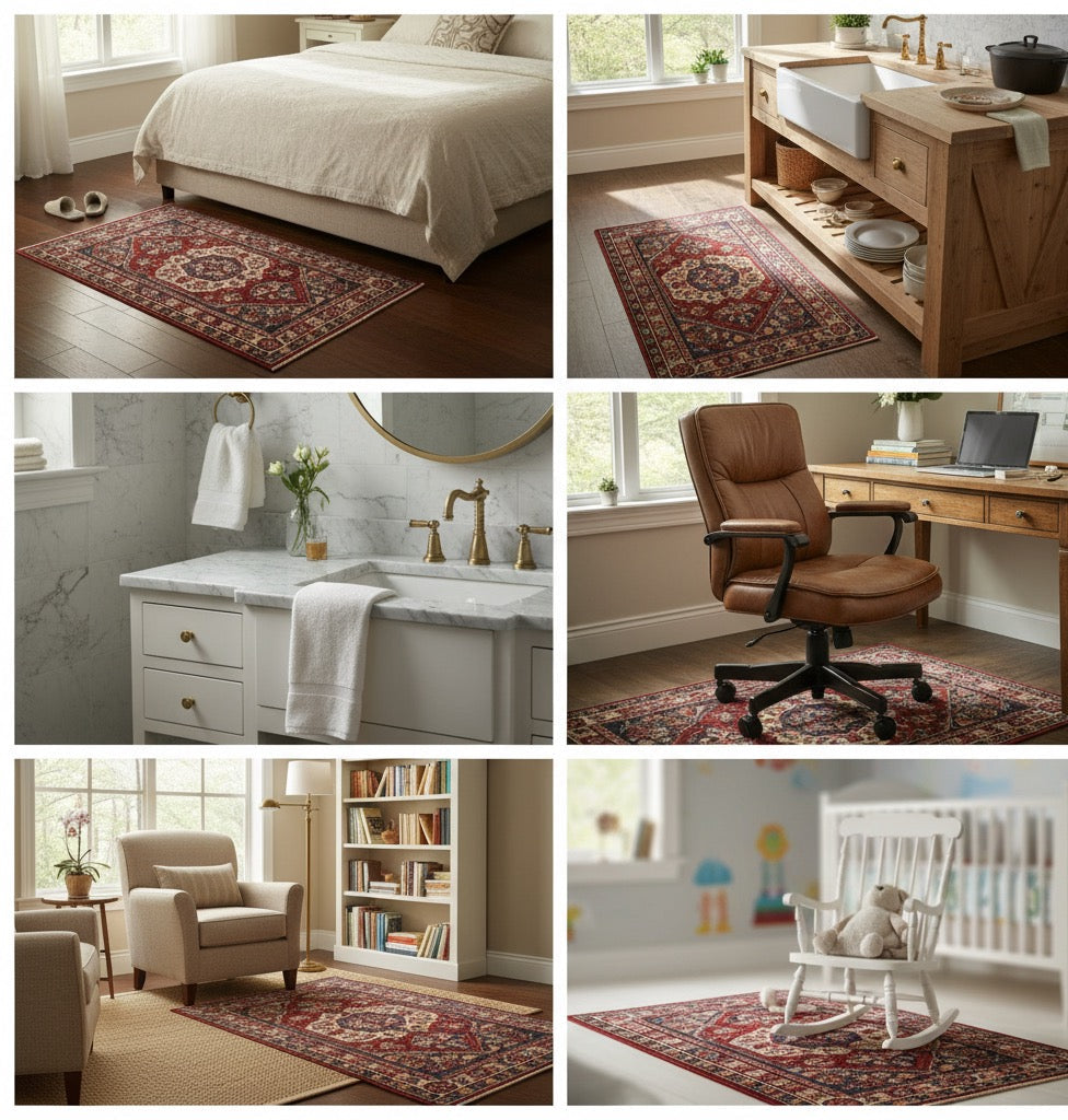 Perfect for entryways and hallways to define the path, kitchen in front of the sink for comfort, beside the bed for a soft landing, stairs for grip and style, and mudrooms/laundry to soften noise and protect floors. In narrow living spaces, runners visually elongate the room while adding warmth and character.